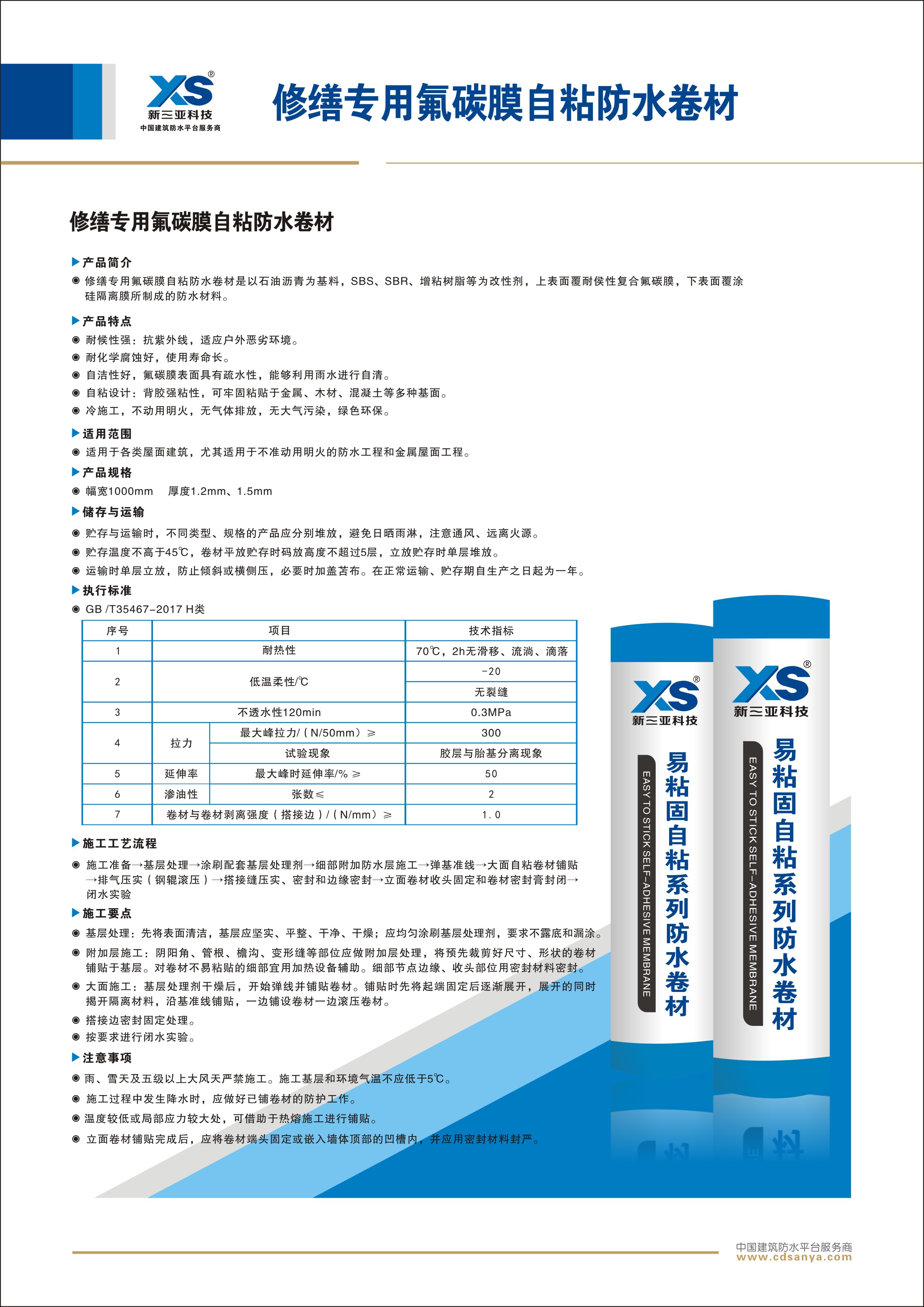 產(chǎn)品特點(diǎn) 1、氟碳膜耐紫外線,適應(yīng)戶外惡劣環(huán)境 2、氟碳膜耐化學(xué)腐蝕,使用壽命長 3、氟碳膜自潔性好,不附著灰塵 4、自粘設(shè)計(jì),鋪貼方便 5、冷粘施工,不動(dòng)用明火,綠色環(huán)保 | ![]() | ![]() |